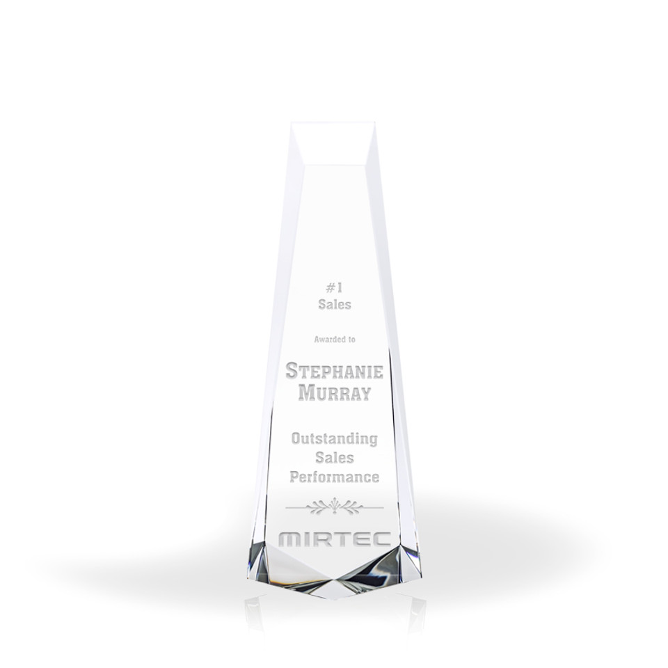 The Foredart Crystal Tower Awards are a gorgeous series of flawless optic crystal awards. These awards make a stunning presentation when included in your recognition program. The Foredart is available in 9″, 10″ & 12″ sizes. Use all three sizes to create a family of awards for different levels of achievement. When it’s time to recognize top performers, significant contributions, innovative solutions, or just commemorate special staff, these awards make a lasting impression on your entire organization.