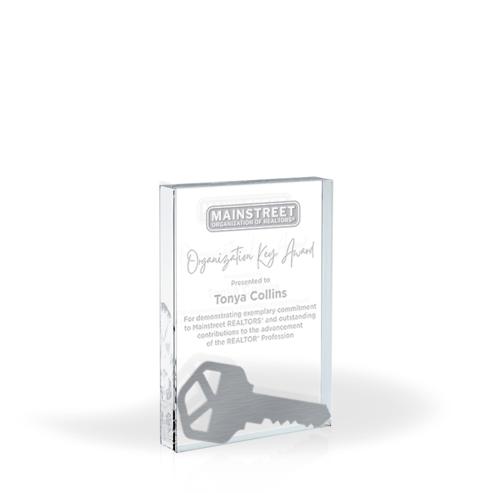 100% made in USA, the Welcome Home Acrylic Award is both attractive and budget friendly. This award of recognition is produced from brilliant, clear, 3/4″ thick acrylic. A satin finish, metal key has been applied to the front of the award, leaving ample space for adding engraved award information including logos, other branding, names, and specific award theme. Due to the thickness of the Welcome Home Acrylic Award, no base is needed and this award can stand on it’s own for easy display anywhere. The Welcome Home Acrylic Award is perfect for recognizing significant achievement in the real estate world, as well as home sales quotas, anniversaries, leadership, customer service, and more. Stands at 7″ tall.